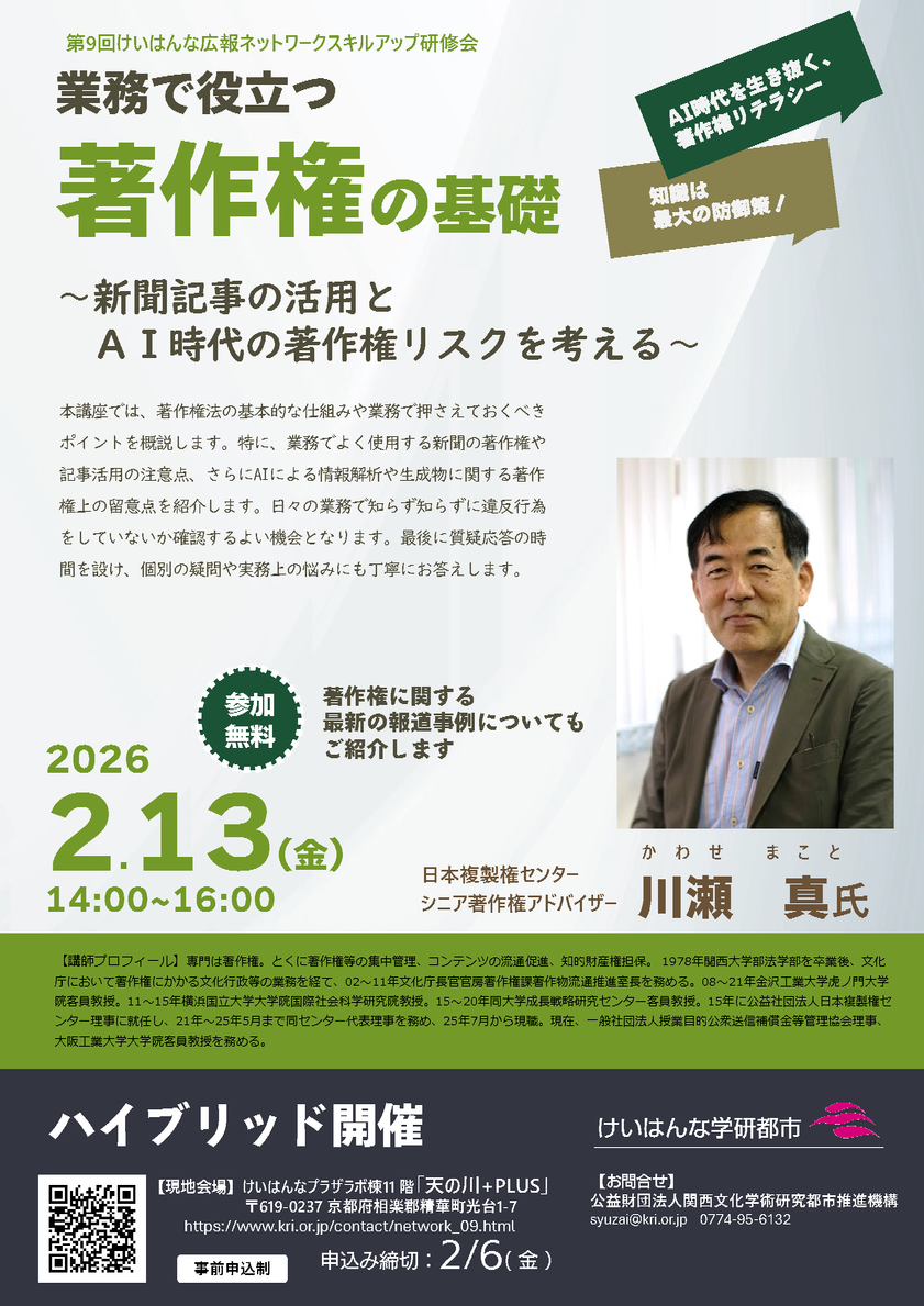 | テーマ | 業務で役立つ著作権の基礎 ~ 新聞記事の活用とAI時代の著作権リスクを考える~ |
