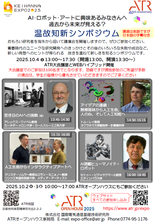 ②個人様(氏名非公表)より、「けいはんな万博2025」の事業の一環として、海外で近年の驚異的な技術革新に影響を与えたとされる5人の研究者を招いて実施する「ATR温故知新シンポジウム」を使途として指定された特定寄附金として6,050,000円の寄附がありました(令和7年6月23日申出)。当該寄附金については、当該事業の共同実施主体である「けいはんな万博2025運営協議会」への分担金として全額を支出いたしました。なお、当日は、約150名の方にご参加いただきました。